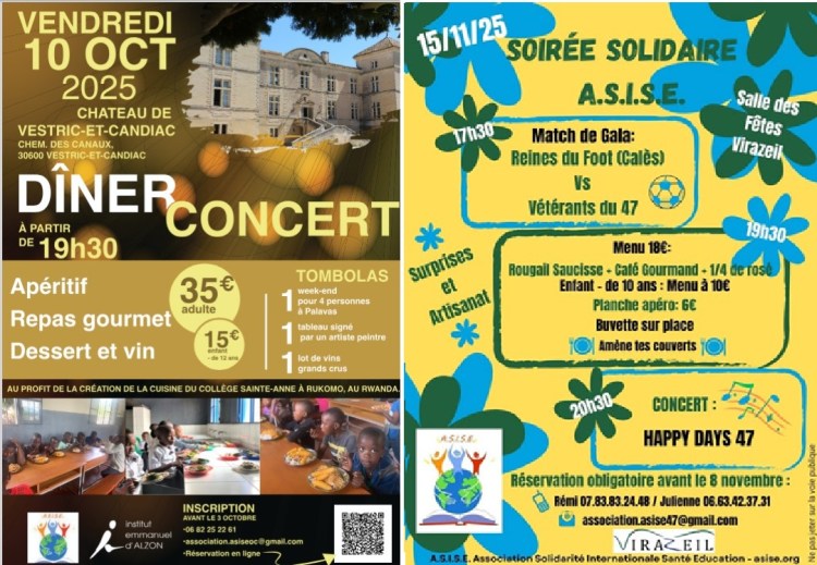 - Diner Concert du 10 Octobre au Chateau de Vestric Candiac organisé au profit d’ASISE avec l’Institut E. d’Alzon pour soutenir le projet de cantine scolaire du complexe scolaire de Rukomo au Rwanda