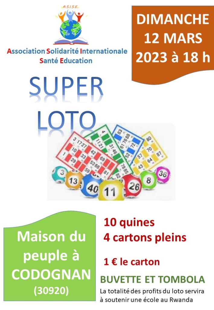 La section ASISE Occitanie organise à Codognan à la Maison du Peuple un super loto au profit d’ASISE et plus précisément de l’Ecole secondaire de Rukomo au Rwanda