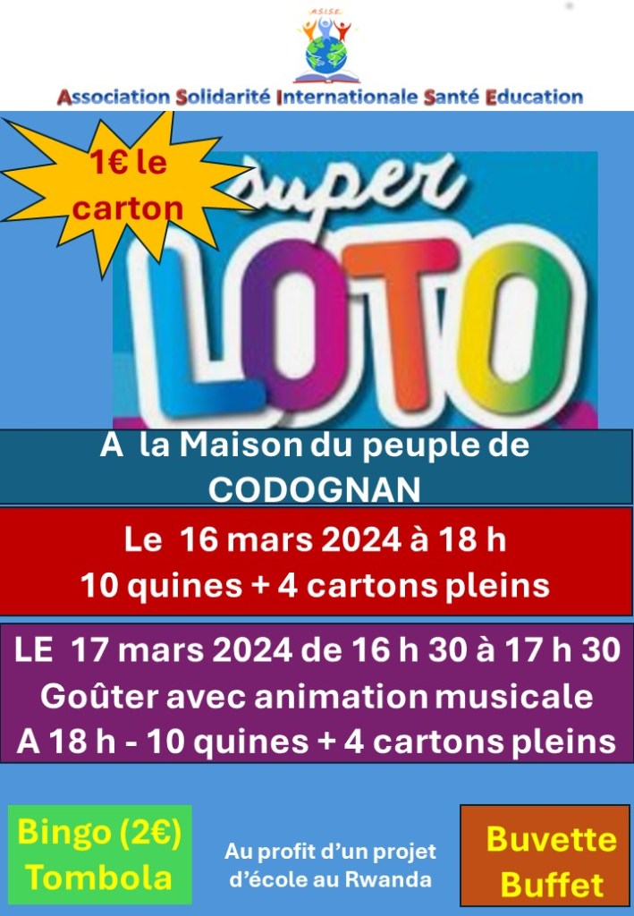 Tous les bénéfices des 2 lotos, bingo, tombola, buvette et buffet sont au profit du projet de l’école secondaire de Rukomo au Rwanda