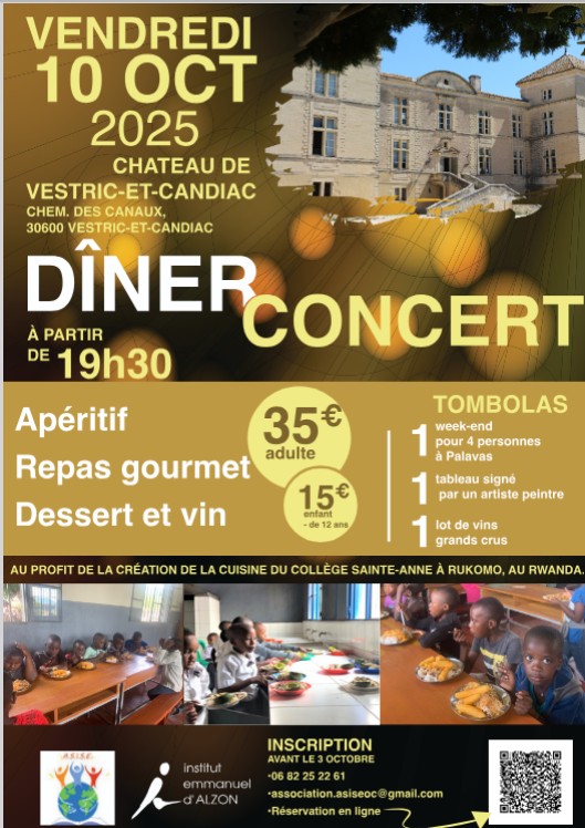 La section Occitanie d’ASISE organise en collaboration avec l’Institut Emmanuel d’Alzon un Diner Concert dans les salles de réception du Chateau de Vestric et Candiac le vendredi 10 Octobre 2025, à partir de 19 h 30 au profit d’ASISE et plus précisément de la construction d’une cantine pour l’Ecole secondaire Sainte Anne au Nord Est du Rwanda.