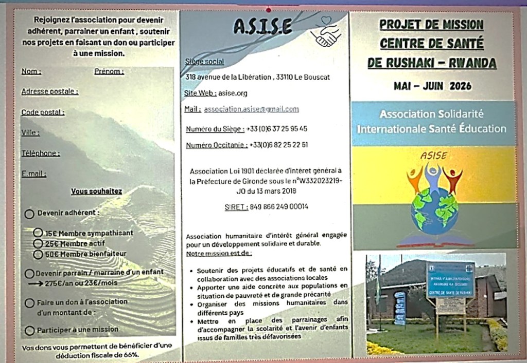 Le groupe sera accueilli du 14 mai au 10 juin 2026 par Soeur Godelive, responsable du Centre de Santé de Rushaki et toute son équipe soignante.